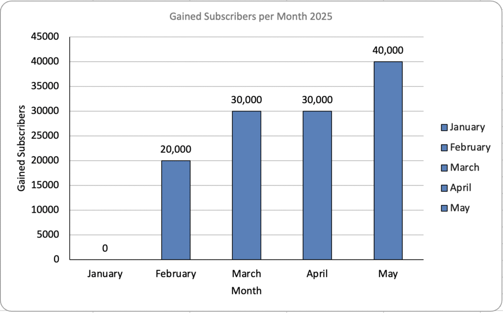 Even with April’s spike in views, May saw the highest subscriber gain (+40K), signaling that Jackson successfully converted viral attention into committed fans.