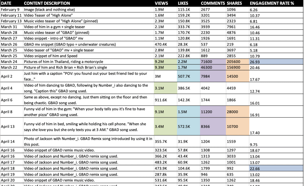 April marks the viral peak of Jackson’s Magic Man 2 cycle with a 354% increase in views over March. This aligns with a sustained TikTok strategy, GBAD remix content, and meme-oriented fan engagement.