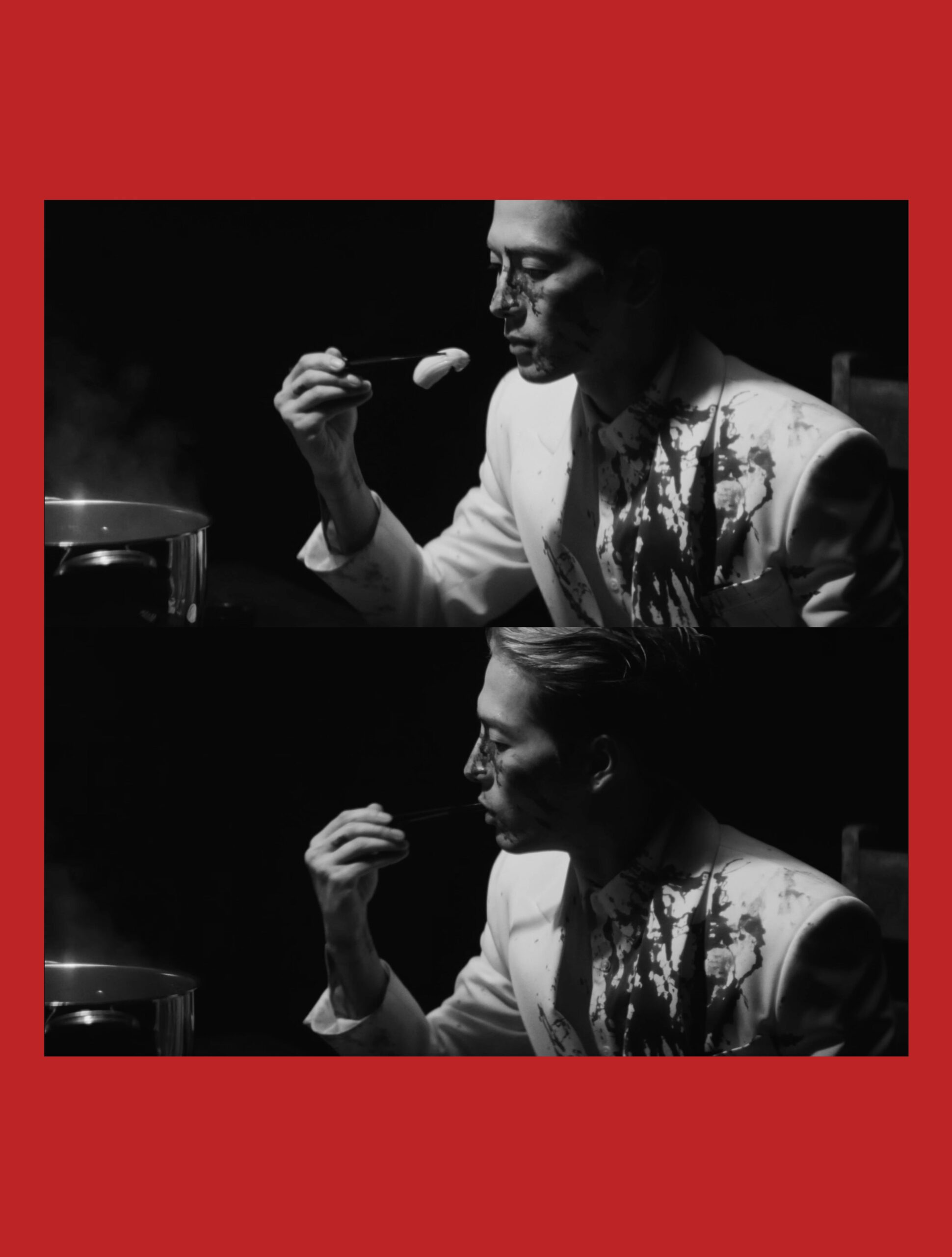 Final shot: He finds himself in the middle of a stage. Still in red. Alone but with a crowd before him. He looks at the audience, exhausted, but not defeated. End of video.